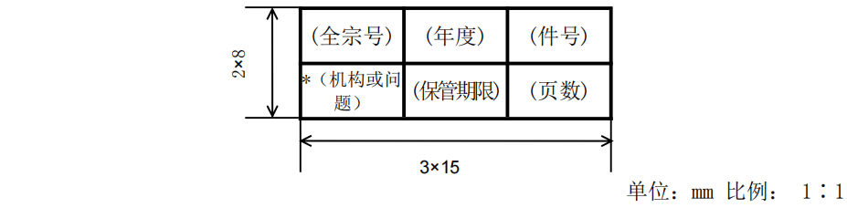 5.4.5歸檔章應(yīng)將檔號的組成部分,即全宗號、年度、保管期限、件號,以及頁數(shù)作為必備項,機(jī)構(gòu)(問 題)可以作為選擇項(見附錄 A 圖 A1)。歸檔章中全宗號、年度、保管期限、件號、機(jī)構(gòu)(問題) 按照 5.4.3 編制,頁數(shù)用阿拉伯?dāng)?shù)字標(biāo)識(見附錄 A 圖 A2)。為便于識記,歸檔章保管期限也可以使用“永久”“30 年”“10 年”簡稱標(biāo)識,機(jī)構(gòu)(問題)也可以用“辦公室”等規(guī)范化簡稱標(biāo)識(見附錄 A 圖A3)。
