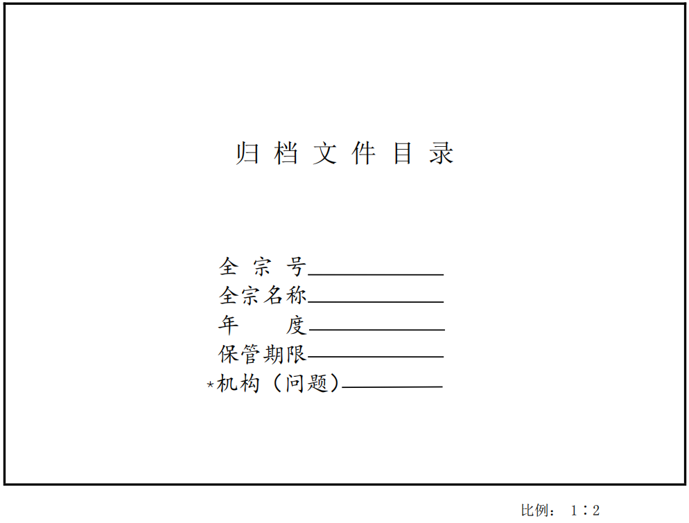 5.5.4歸檔文件目錄除保存電子版本外,還應(yīng)打印裝訂成冊。裝訂成冊的歸檔文件目錄,應(yīng)編制封面(見 附錄 B 圖 B2)。封面設(shè)置全宗號、全宗名稱、年度、保管期限、機(jī)構(gòu)(問題),其中全宗名稱即立檔單位名稱,填寫時應(yīng)使用全稱或規(guī)范化簡稱。歸檔文件目錄可以按年裝訂成冊,也可每年區(qū)分保管期限裝訂成冊。
