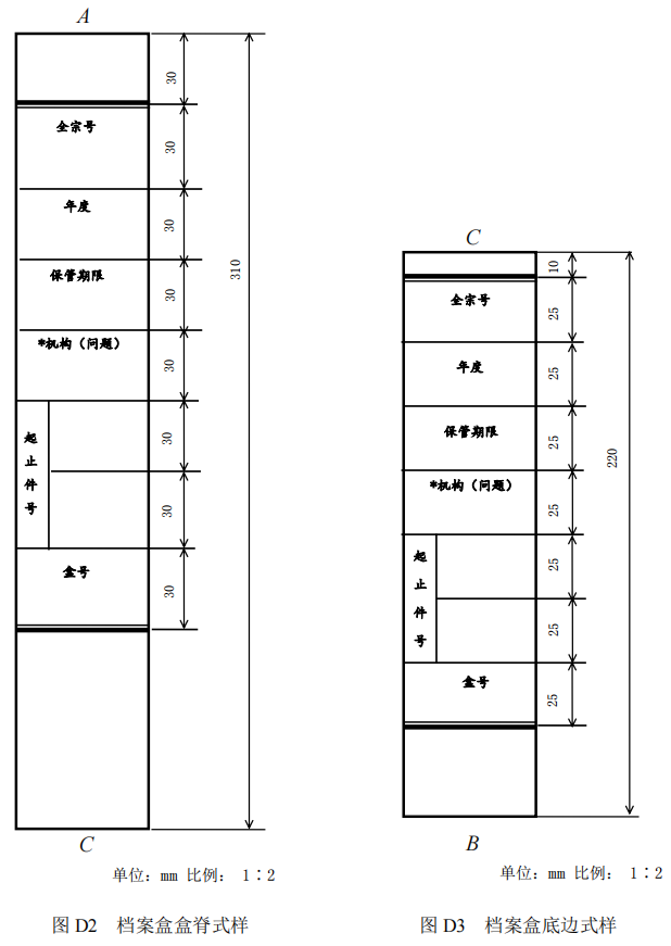 6.4.1.2檔案盒應(yīng)根據(jù)擺放方式的不同,在盒脊或底邊設(shè)置全宗號、年度、保管期限、起止件號、盒號等必備項,并可設(shè)置機(jī)構(gòu)(問題)等選擇項(見附錄 D 圖 D2、圖 D3)。其中,起止件號填寫盒內(nèi)第一件文件和最后一件文件的件號,起件號填寫在上格,止件號填寫在下格;盒號即檔案盒的排列順序號,按進(jìn)館要求在檔案盒盒脊或底邊編制。