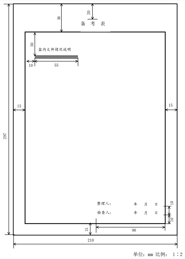 備考表置于盒內(nèi)文件之后,項目包括盒內(nèi)文件情況說明、整理人、整理日期、檢查人、檢查日期(見附錄 E)。
