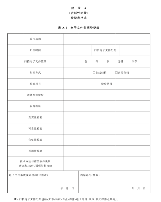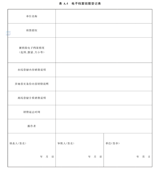 10.3.7應(yīng)填寫電子檔案銷毀登記表(見表 A.4)并歸檔保存。