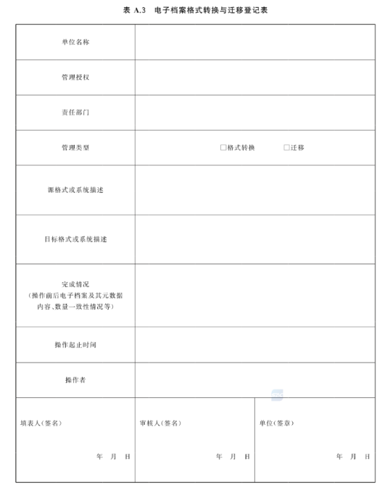 10.2.5 電子檔案及其元數(shù)據(jù)庫的轉(zhuǎn)換、遷移活動應(yīng)記錄于電子檔案管理過程元數(shù)據(jù)中,并填寫電子檔案格式轉(zhuǎn)換與遷移登記表(見表 A.3)。