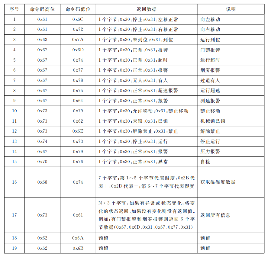 智能密集架控制器返回給固定列工控機的數(shù)據(jù)幀∶