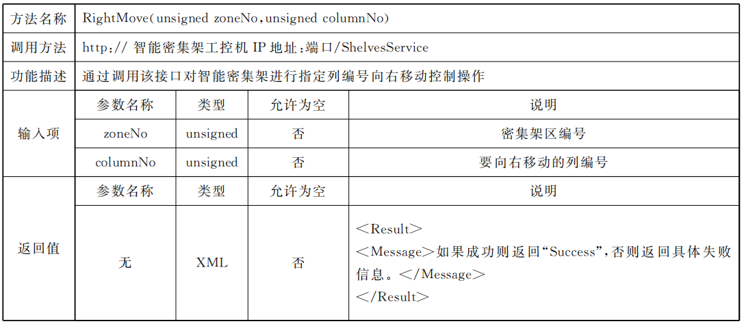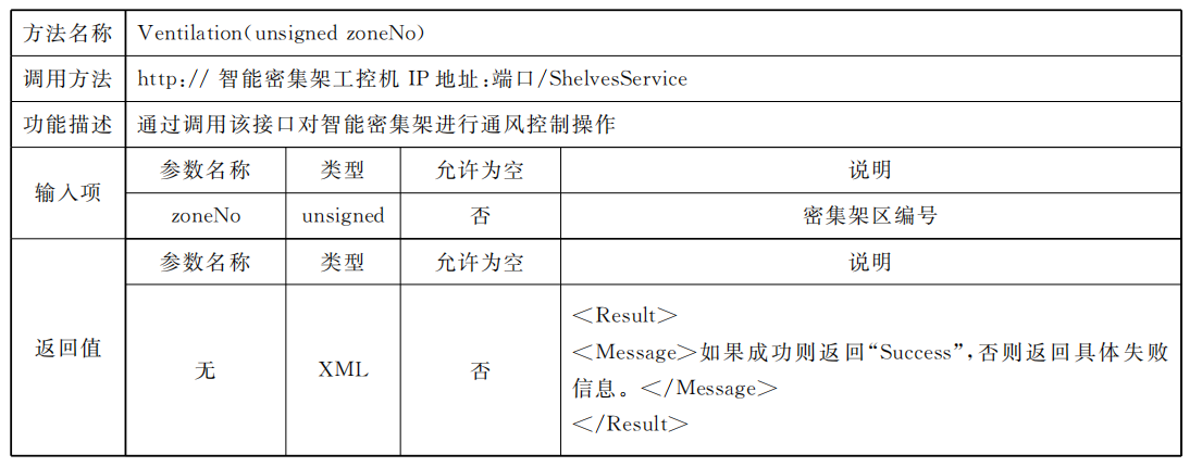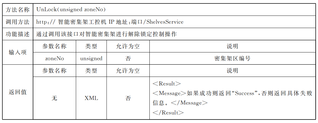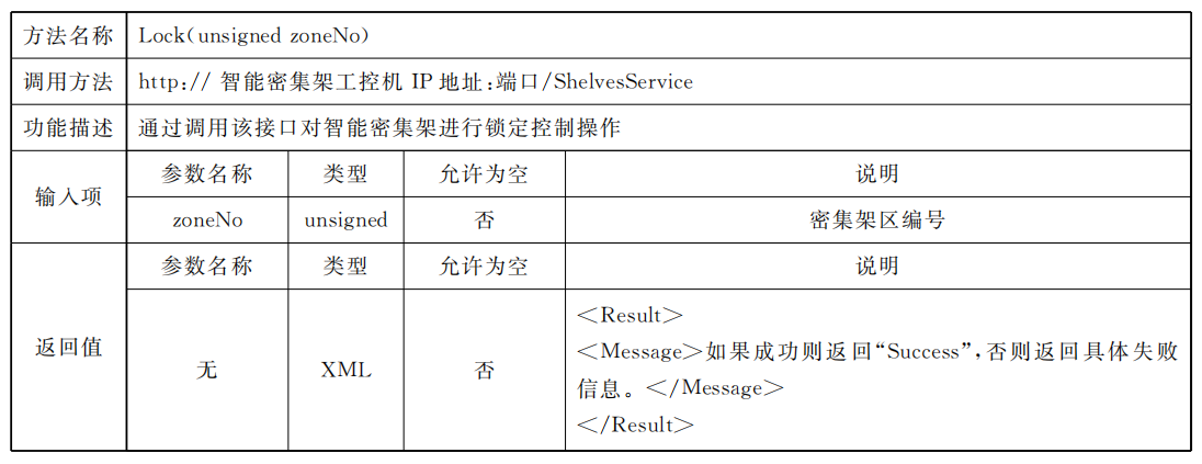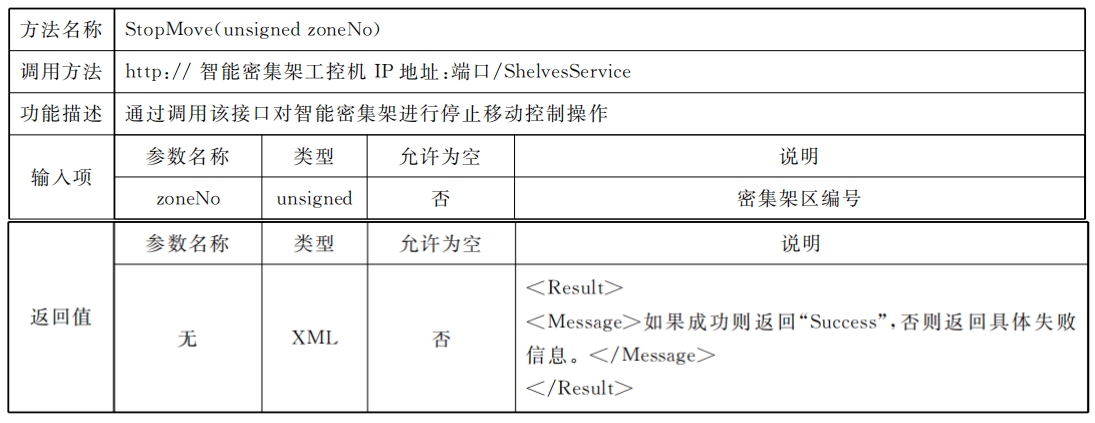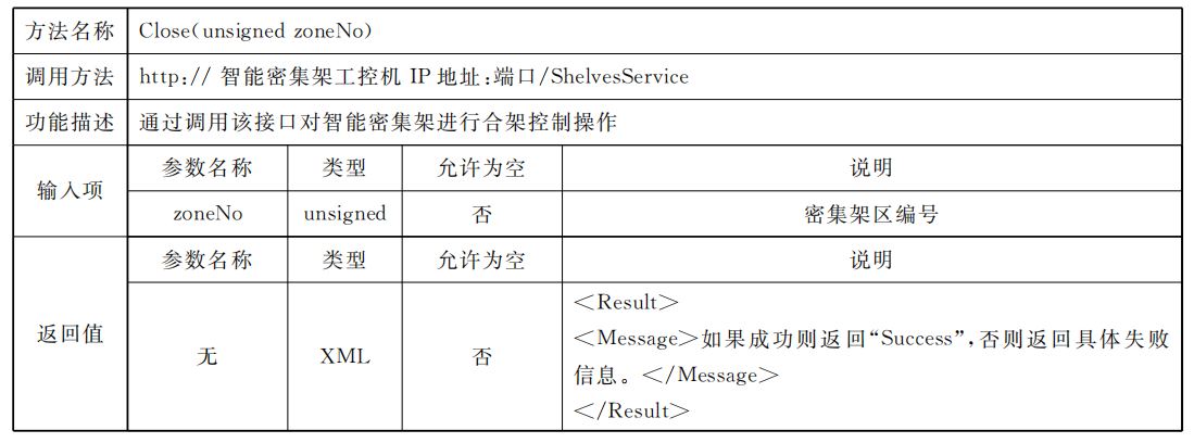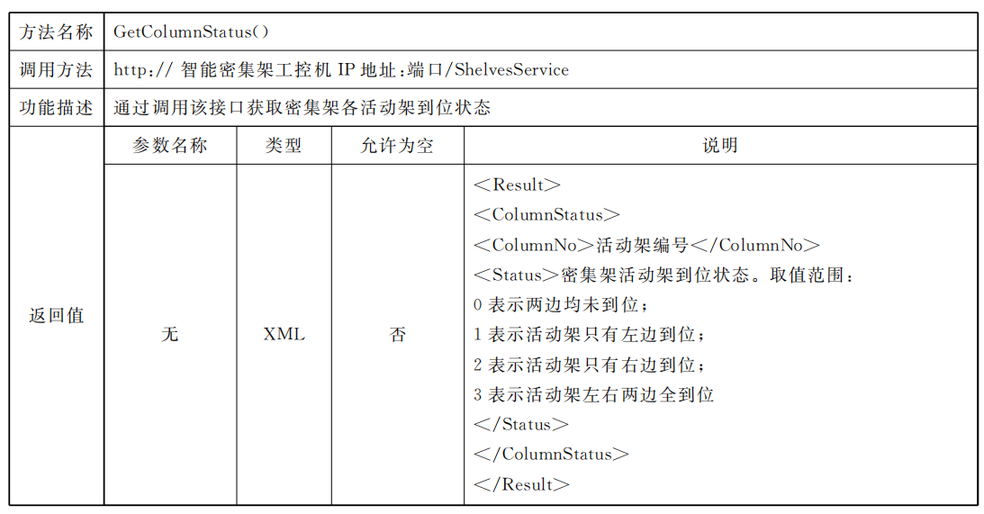 密集架控制系統(tǒng)應同時具備總線協(xié)議方式以及Web Service協(xié)議方式,供外部設(shè)備或外部應用進行調(diào)用總線協(xié)議標準采用RS485接口,通過區(qū)域控制總線進行通信,但不排除同時使用其他總線通信方式的可能,總線通信協(xié)議見附錄A;Web Service通信應滿足數(shù)據(jù)傳輸安全要求,網(wǎng)絡通信協(xié)議見附錄B。