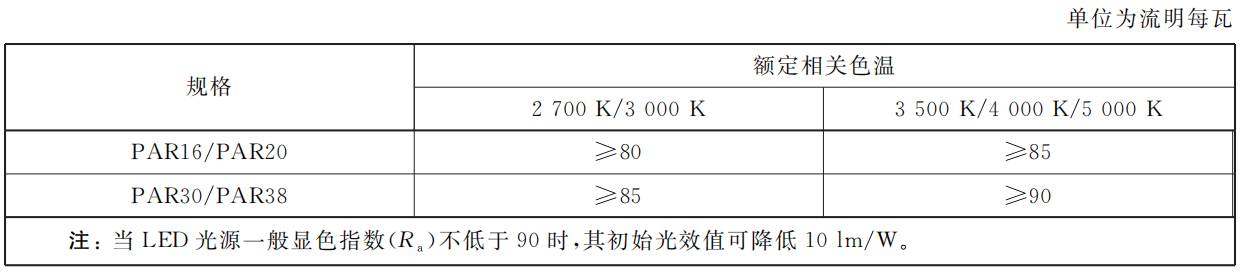 4.2.6 定向 LED光源的初始光效值應(yīng)符合表2的規(guī)定。