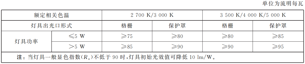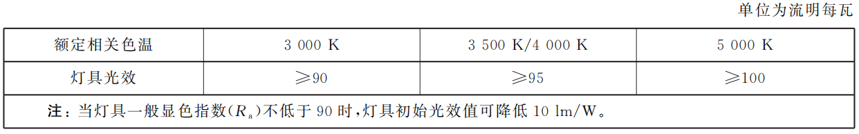 4.3.7 LED高天棚燈具的初始光效值應(yīng)符合表4規(guī)定。