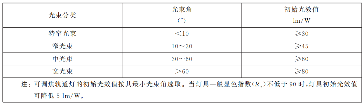 4.3.8 陳列廳用軌道燈及射燈的初始光效值應(yīng)符合表5的規(guī)定。
