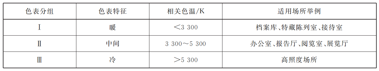 5.5.1 室內(nèi)照明光源的色表可按其相關(guān)色溫分為3組,光源色表分組宜按表9確定。