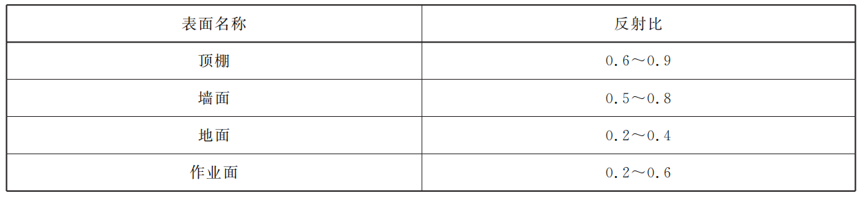 長時間工作的房間或場所,其表面反射比宜按表10選取。
