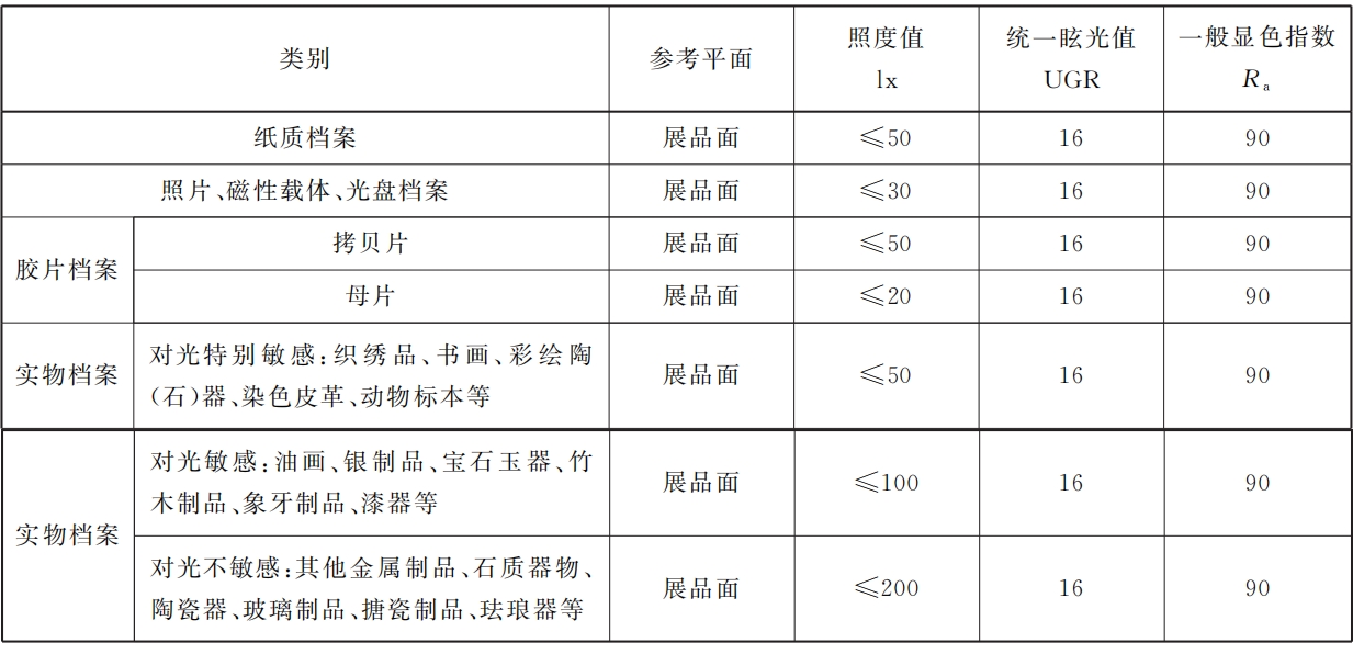 表12 特藏陳列室檔案展品照明標(biāo)準(zhǔn)值