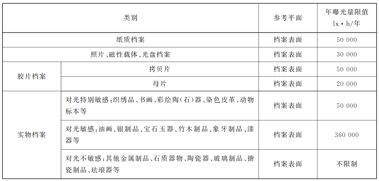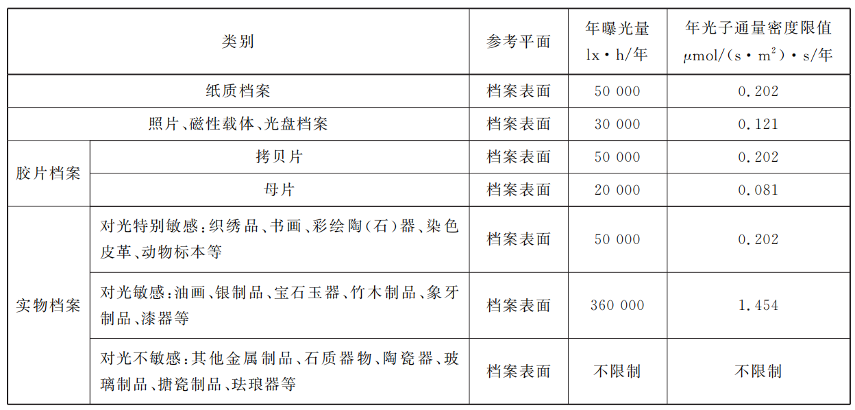 5.8.4 對光敏感的檔案,其年曝光量不應(yīng)大于表13的限值,針對 LED 光源的年光子通量密度限值可參照附錄 B。