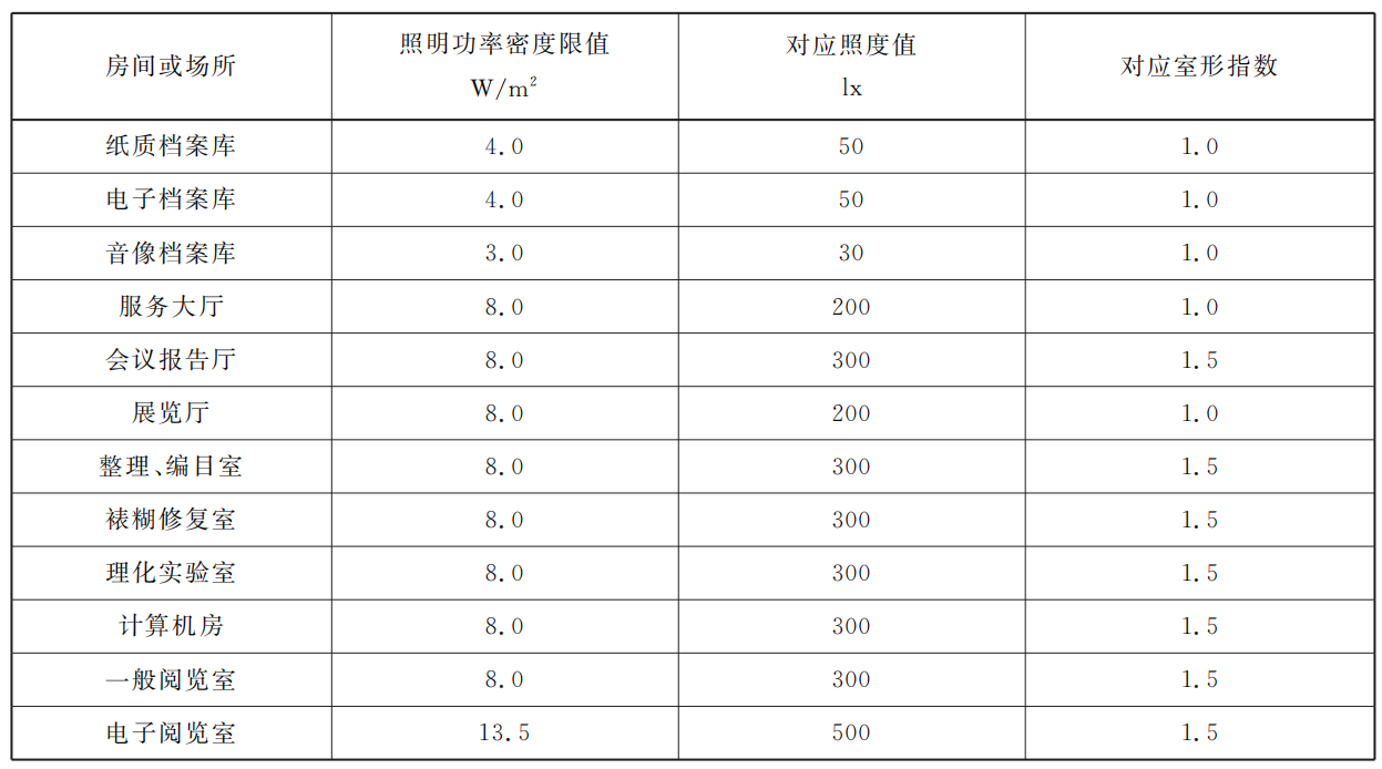 表14 檔案館有關(guān)房間或場所的照明功率密度限值