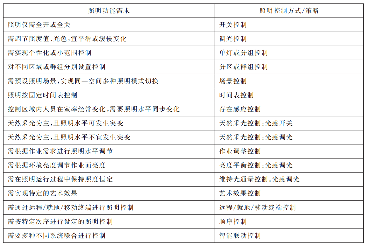 表15 照明功能需求對應(yīng)的照明控制方式/策略