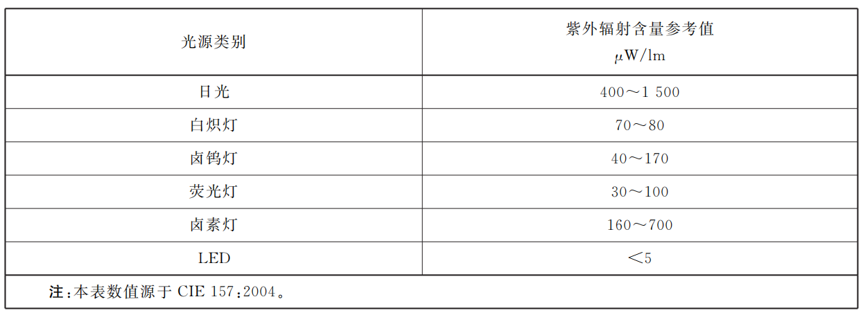 表 A.1給出了各類裸光源的紫外輻射含量參考值。