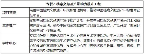 26.積極參與聯(lián)合國教科文組織世界記憶項目。加強(qiáng)與聯(lián)合國教科文組織世界記憶項目秘書處和國際咨詢委員會合作,積極參與世界記憶項目亞太地區(qū)委員會各項活動。加強(qiáng)統(tǒng)籌謀劃,促進(jìn)入選文獻(xiàn)研究和宣傳推廣。促進(jìn)世界記憶項目與聯(lián)合國教科文組織其他遺產(chǎn)項目協(xié)同發(fā)展。發(fā)揮世界記憶項目北京、福建和蘇州等學(xué)術(shù)中心作  用。實施檔案文獻(xiàn)遺產(chǎn)影響力提升工程。